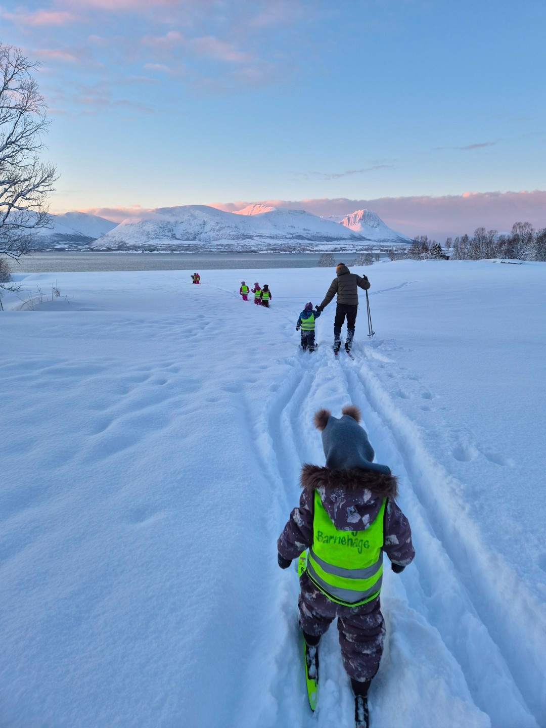 Tenk så heldige vi er som kan gå rett over veien også kan vi boltre oss med ski på bena på det store jordet. Skiene blir flittig brukt av barna i Berg barnehage på denne årstiden!